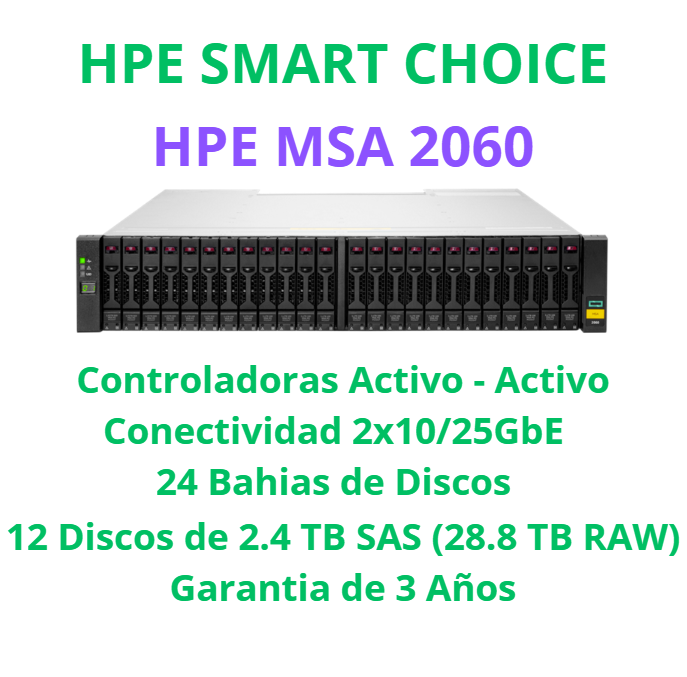 Paquete de cabina HPE MSA 2060 2U SFF con dos controladores de 4 puertos 10/25 GbE iSCSI- doce HDD 2-4 TB 10 000 rpm SFF- cuatro transceptores 10 Gb iSCSI SFP+ y dos fuentes redundantes de 580 W